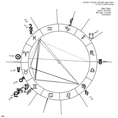 Chi era Mary Tabor? Mistero. Non lo si sa bene, ma abbiamo la data della sua nascita, che mi permette, dopo una minuziosa verifica, di calcolare il tema natale del suo cielo di nascita, cosa che ci aiuterà a sapere qualcosa di più su Mary Tabor e a comprendere, sotto l’ottica astrologica, il perché della strana attrazione nei suoi confronti da parte di Eduardo Grecco e Lluís Juan Bautista.
